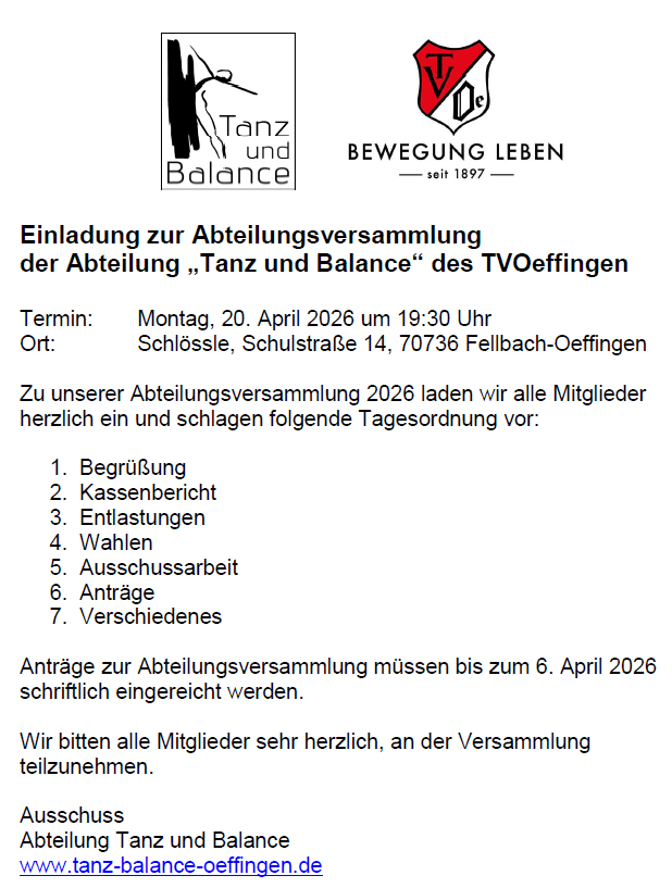 Einladung zur Abteilungsversammlung der Abteilung „Tanz und Balance“ des TVOeffingen